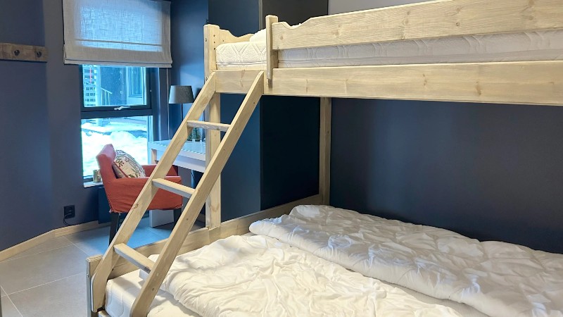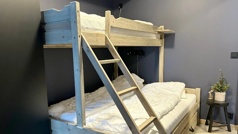 Sovrum 2: 1 våningssäng med 150 cm bred underslaf och 110 cm bred överslaf.