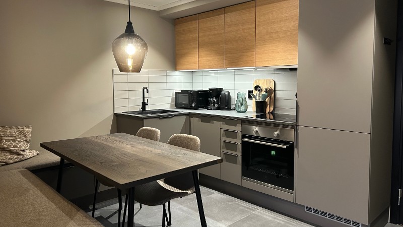 Lägenhet med öppen planlösning mellan allrum och köksdel, 2 sovrum, 1 badrum, bastu.